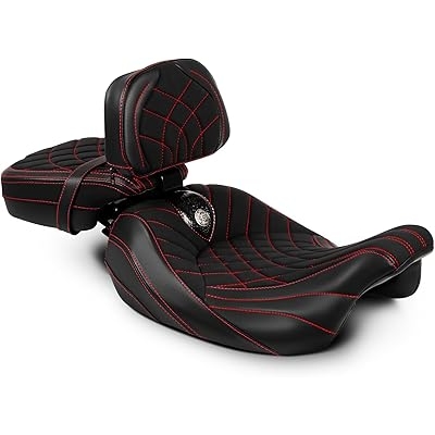 Low Profile Two-Up Rider Passenger Seat and Backrest Silicone Cushion Diamond Pattern Compatible with Harley Touring Street Glide Road King Road Glide Electra Glide 2009-2023 Red Stitching